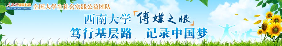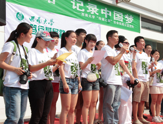 西南大學(xué)“傳媒之眼”社會(huì)實(shí)踐隊(duì)由新聞傳媒學(xué)院團(tuán)委老師李海峰、范曦帶隊(duì),8名研究生、19名本科生組成。團(tuán)隊(duì)圍繞“篤行基層路,記錄中國夢(mèng)”的主題,自7月3日開始,從建設(shè)生態(tài)北碚、“百姓中國夢(mèng)”主題宣講、“幸福重慶”人文記錄、“山城百姓”社會(huì)調(diào)查四個(gè)方面開展活動(dòng)。團(tuán)隊(duì)已經(jīng)在歇馬鎮(zhèn)碚青路中心廣場舉行了文藝匯演,并給群眾帶來了各種各樣的避暑藥品;到歇馬污水處理廠,了解當(dāng)?shù)厣a(chǎn)生活污水的處理;到重慶歇馬機(jī)械曲軸有限公司,宣傳“節(jié)能生產(chǎn)”理念,在員工中開展環(huán)保培訓(xùn),強(qiáng)調(diào)可持續(xù)生產(chǎn)和發(fā)展。