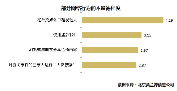 哪些行為在網(wǎng)絡(luò)世界中最不道德?調(diào)查顯示,“在社交媒體中騷擾他人”被認(rèn)為最不道德;其次是“使用盜版軟件”;“瀏覽或與朋友分享色情內(nèi)容”以及“對新聞事件當(dāng)事人進行人肉搜索”這兩項行為被認(rèn)為處于“一般”和“輕微不道德”之間。