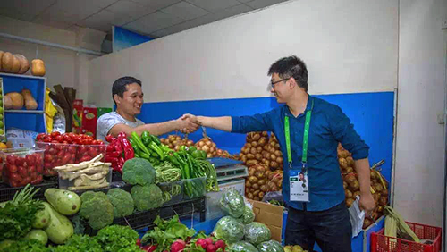 一走進(jìn)農(nóng)貿(mào)市場(chǎng),很多商戶們都主動(dòng)跟我們的問好,這當(dāng)然是因?yàn)閮擅髲N是“采購大戶”,都希望能多照顧下自家的生意。各樣蔬菜、各式水果、各種主食,兩位大廚都要精心挑選、仔細(xì)詢問比劃,整個(gè)采購過程緊湊而細(xì)致。