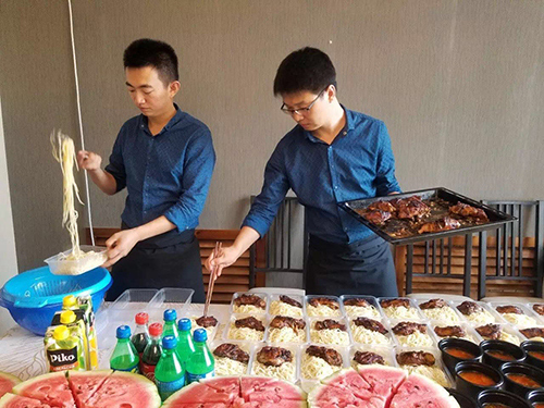 趁著兩位大廚張羅著分發(fā)盒飯的功夫,小編趕緊跟大廚交流起來。這兩位大廚分別是劉會(huì)彬和高德發(fā),都是名副其實(shí)的“90后”,別看年輕,兩位大廚的廚藝精湛,參與保障過青島國(guó)際啤酒節(jié)、國(guó)際象棋大賽等國(guó)際節(jié)慶活動(dòng)及賽事。
