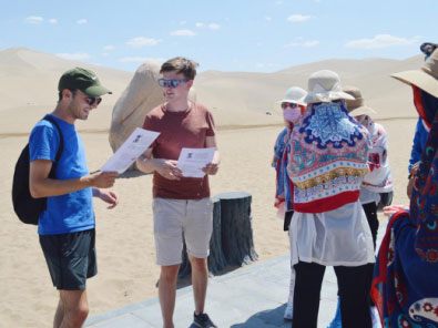 在敦煌的鳴沙山與月牙泉,兩名英國(guó)劍橋大學(xué)的大學(xué)生對(duì)“一帶一路”和“絲綢之路”概念的熟知程度令團(tuán)隊(duì)成員十分驚訝,外國(guó)青年對(duì)中國(guó)的文化歷史的濃厚興趣也令交流采訪十分順利和有趣。