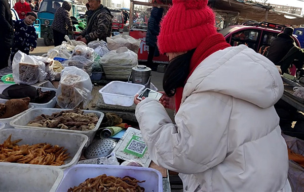 “小伙子,手機(jī)帶了嗎?掃一掃,你就用微信付款吧!”這是攤販大爺?shù)穆曇。江蘇徐州市豐縣的“閆家小旭”對(duì)家鄉(xiāng)集市上菜攤前的二維碼,頗為吃驚,不敢相信。她說:“不到一年時(shí)間,發(fā)現(xiàn)家鄉(xiāng)變化真得好大。中國(guó)特色社會(huì)主義‘走進(jìn)新時(shí)代’,農(nóng)村里的樓房越蓋越高,院子也越來越寬敞。鄉(xiāng)間小道變成平整寬闊的水泥路,飛奔的火車也通往家鄉(xiāng)。手機(jī)支付走進(jìn)鄉(xiāng)間集市攤販,西紅柿、茄子、黃瓜、豆角等反季節(jié)蔬菜也成為春節(jié)餐桌上的家常菜!
