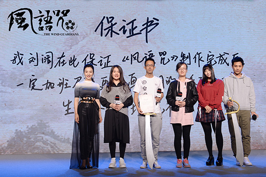 發(fā)布會現(xiàn)場,導演劉闊收到了來自粉絲扛來的“刀片”,簽下“按時更新保證書”。出品人陶虹自曝自己是“畫江湖”系列的忠實粉絲,此次參與滿足了作為一個粉絲的“私心”,F(xiàn)場,她和知名配音演員邊江、山新演繹了《風語咒》人物經(jīng)典之聲,嗨爆全場。