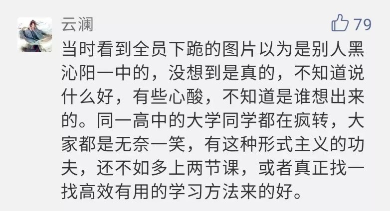 視頻發(fā)布后引發(fā)了網(wǎng)友討論。有人質(zhì)疑此活動(dòng)過(guò)于“形式主義”,遭學(xué)校官號(hào)怒懟:思維是不是有毛。11月21日,該所學(xué);貞(yīng)稱,校領(lǐng)導(dǎo)在活動(dòng)前不知情,是高三年級(jí)安排的,下跪只是一種形式,想教孩子們學(xué)會(huì)感恩。