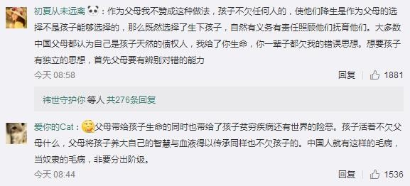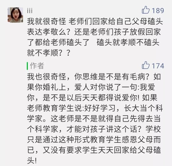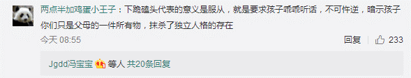 網(wǎng)友“兩點(diǎn)半加雞蛋小王子”:下跪磕頭代表的意義是服從,就是要求孩子乖乖聽(tīng)話,不可忤逆,暗示孩子你們只是父母的一件所有物,抹殺了獨(dú)立人格的存在。
