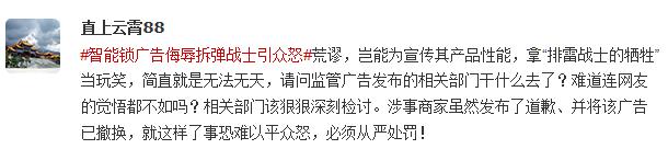 近日,“凱迪仕智能鎖”新浪微博賬號(hào)發(fā)布的一則“拆彈磚家”視頻廣告引發(fā)爭議。視頻中,為宣傳其產(chǎn)品“只有一只手也能開鎖”的性能,使用了“排雷戰(zhàn)士”被炸得粉身碎骨回到家的情節(jié),甚至還安排了“排雷戰(zhàn)士”被“炸”成了綿羊、輪胎、電飯煲。江蘇省公安廳網(wǎng)絡(luò)安全保衛(wèi)總隊(duì)官方微博批評(píng)稱,“網(wǎng)絡(luò)營銷應(yīng)有最起碼的道德是非觀念,不要把無知當(dāng)創(chuàng)意,把惡搞當(dāng)搞笑!”