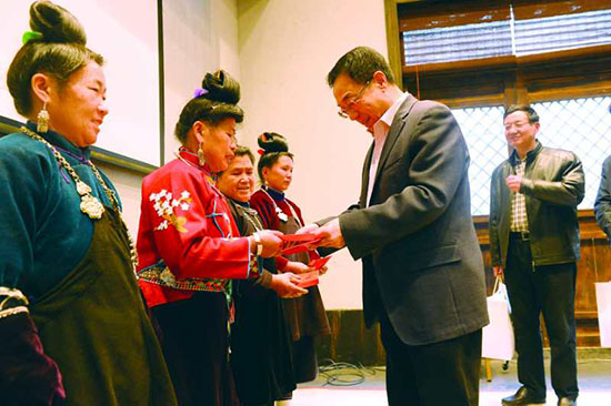 人民網(wǎng)北京1月28日電(記者周晶)在黔東南州丹寨縣龍泉鎮(zhèn)馬寨村,當(dāng)建檔貧困戶李明忠和他的妻子從全國人大社會(huì)建設(shè)委員會(huì)副主任委員、中國社會(huì)工作聯(lián)合會(huì)宮蒲光會(huì)長手里接過厚暖的羽絨服、糧油品和慰問金時(shí),憨厚的夫妻倆有些激動(dòng),嘴里一直不停的說“謝謝謝謝……”。