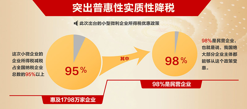張連起:提高增值稅小規(guī)模納稅人起征點,放寬小型微利企業(yè)標(biāo)準(zhǔn)并加大優(yōu)惠力度。這比原來認(rèn)定的標(biāo)準(zhǔn)有大幅度的提升,也就是說有更多的企業(yè)會被認(rèn)定為小型微利企業(yè)。據(jù)測算,認(rèn)定為小型微利企業(yè)戶數(shù)1798萬戶,占全部納稅企業(yè)的比重超過95%,其中98%是民營企業(yè)。也就是說,我國絕大部分企業(yè)主體都能夠從這個政策中受惠。