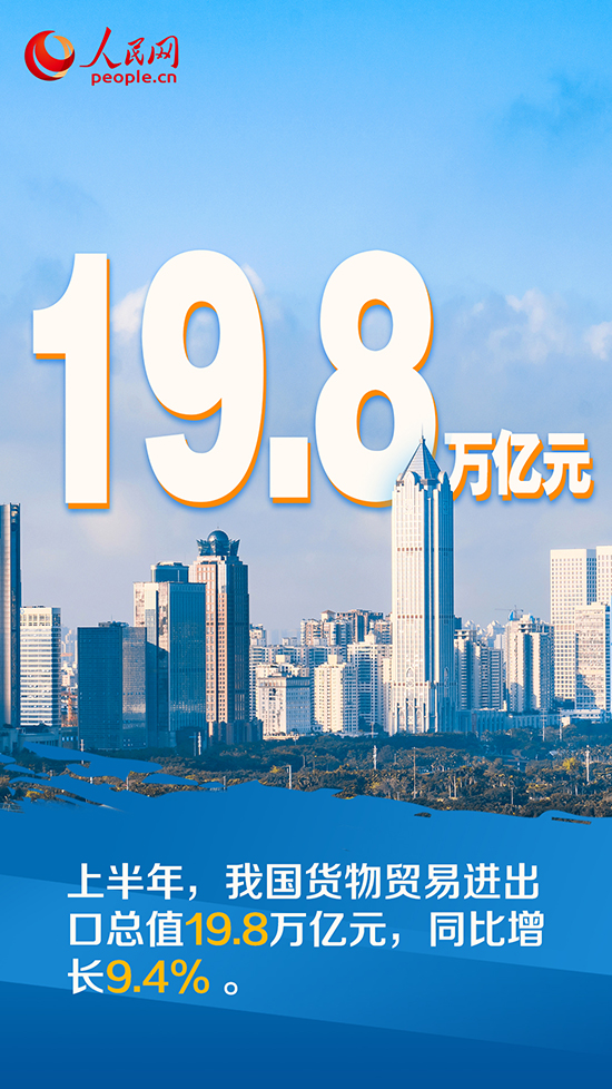 據(jù)海關(guān)統(tǒng)計,今年上半年我國貨物貿(mào)易進出口總值19.8萬億元,同比增長9.4%。其中,出口11.14萬億元,增長13.2%;進口8.66萬億元,增長4.8%……上半年外貿(mào)進出口“答卷”傳遞出我國經(jīng)濟持續(xù)恢復(fù)的積極信號。