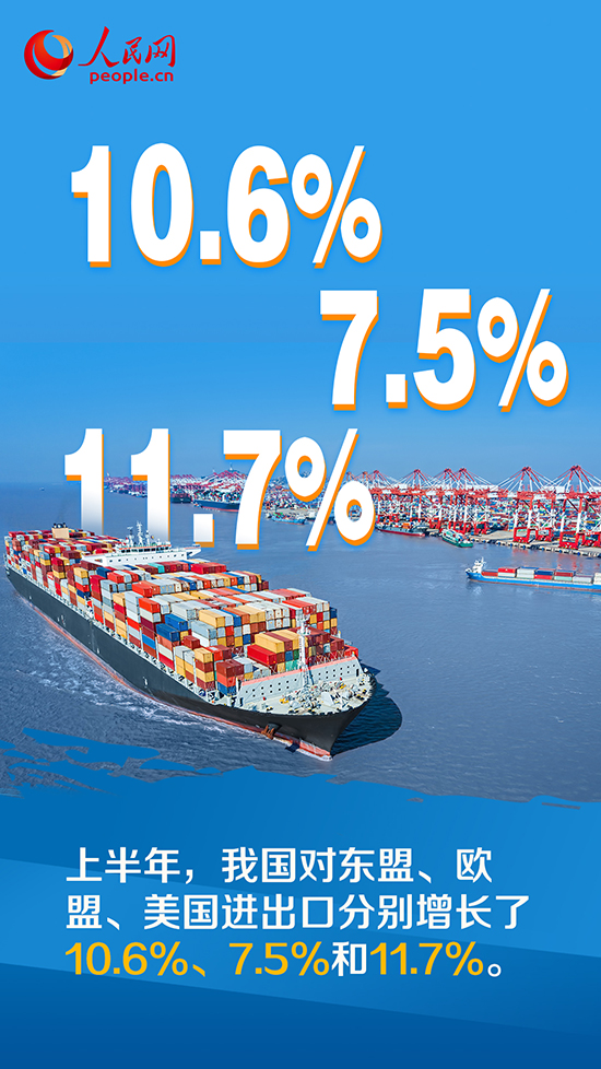 上半年,我國對東盟、歐盟、美國進出口分別增長了10.6%、7.5%和11.7%。同期,我國對“一帶一路”沿線國家、區(qū)域全面經(jīng)濟伙伴關(guān)系協(xié)定(RCEP)貿(mào)易伙伴進出口分別增長17.8%和5.6%。