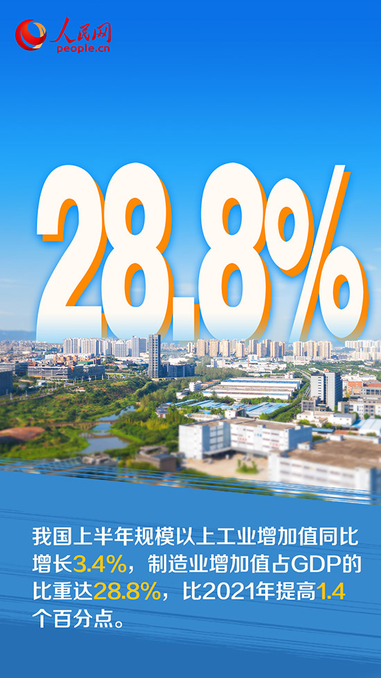 上半年,在各地區(qū)各部門共同努力下,盡管面臨疫情沖擊,產(chǎn)業(yè)鏈供應(yīng)鏈日益穩(wěn)定暢通,工業(yè)經(jīng)濟(jì)迅速扭轉(zhuǎn)了下滑態(tài)勢(shì),實(shí)現(xiàn)了恢復(fù)增長(zhǎng)。國(guó)新辦7月19日舉行發(fā)布會(huì)介紹,今年上半年,我國(guó)規(guī)模以上工業(yè)增加值同比增長(zhǎng)3.4%,規(guī)模以上制造業(yè)增加值同比增長(zhǎng)2.8%,制造業(yè)增加值占GDP的比重達(dá)28.8%,比2021年提高1.4個(gè)百分點(diǎn)。