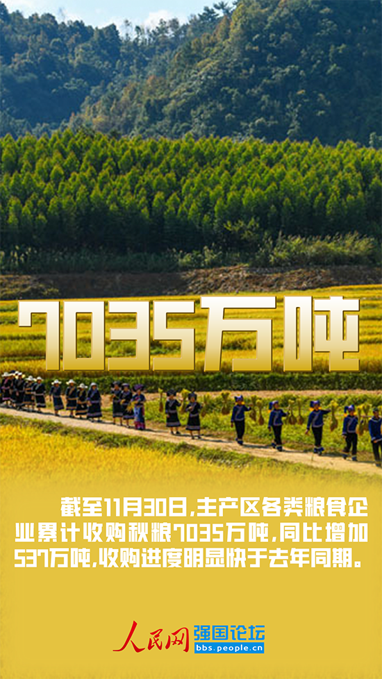 隨著各地大規(guī)模秋收結(jié)束,秋糧開始集中上市交易。據(jù)國家糧食和物資儲備局最新發(fā)布,截至11月30日,主產(chǎn)區(qū)各類糧食企業(yè)累計收購秋糧7035萬噸,同比增加537萬噸,收購進度明顯快于去年同期!跋啾扔2021年、2020年、2019年的6498萬噸、6803萬噸、5614萬噸,與歷年同期相比,今年達到了近年來糧食企業(yè)秋糧收購數(shù)量的最高值。”李新海說道。